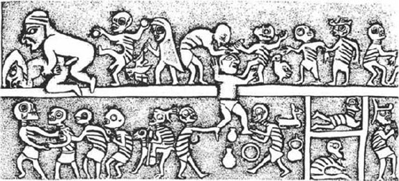Nessa cultura peruana, a iconografia é largamente estudada desde o século XIX; nela, é possível observar cenas de festins, que envolvem rituais mortuários e a referência à função de guia das almas, ou psicopompo, vinculados à fauna, sobretudo aos camelídeos (Goepfert 2010) e às aves strigiforrmes (corujas) inumados juntos aos mortos da cultura mochica. Esse dado é uma forte evidência da importância desses animais no contexto funerário para essa população pretérita (Arsenault 1992; 1994).