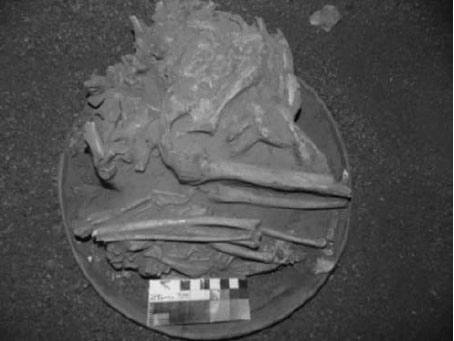 Segundo Queiroz e Carvalho (2005), nessa mesma sepultura, foi evidenciado um esqueleto de animal parcialmente completo, articulado, com esqueleto em conexão anatômica, com poucos ossos menores dispersos, tratando-se de um representante da família Mustelidae, um furão Galictis cuja (Molina 1782), cujas características morfológicas levam a acreditar que este teria sido inumado antes da fase adulta (figura 4). Torna-se importante considerar que o registro dessa espécie em contextos funerários no Brasil, até o presente momento, configura-se como inédito e que, devido às particularidades de sua inumação (posição do corpo em relação ao esqueleto humano, ausência de estigmas ou marcas de violência, ossos articulados), não se considerou a possibilidade deste ser um animal intrusivo (bioturbação).