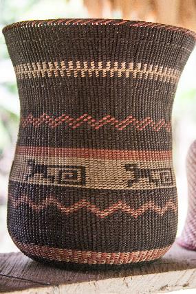 Entre las cestas masculinas utilizadas para el procesamiento de la yuca y el almacenamiento de alimentos tenemos, en orden de secuencia según su uso, los tonkoi (conocidos popularmente como sebucanes), que son grandes cestas cilíndricas con las que se exprime la yuca rallada para secarla y extraer el cianuro del tubérculo (ver la figura 2). Encontramos también los manade o cernidores (ver la figura 3), utilizados para tamizar la yuca exprimida y seca, acompañadas siempre de las waja tingkuihato (ver la figura 3), también llamadas “waja” monocromáticas, ya que sus fibras no están teñidas sino que los patrones se consiguen gracias al entrelazamiento en anverso y reverso de las fibras (Guss 1994). Su forma de platos-bandeja de gran tamaño sirve para almacenar la yuca tamizada.