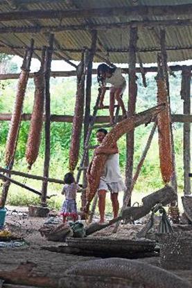Es por ello comprensible que sean los hombres los encargados de mediar con el mundo indómito, tejiendo las fibras obtenidas en el espesor de la selva hasta convertirlas en objetos domésticos. La recolección de las fibras y el proceso del tejido de las cestas tienen que seguir así ciertas normas, comenzando por pedir permiso a los dueños5 de las plantas de donde se obtienen las fibras, hasta los cantos finales para evitar o apaciguar la potencial ira de los dueños y asegurar una buena funcionalidad de la cesta. Mientras tanto, las mujeres son las encargadas del proceso de elaboración y cocción de estas materias, una vez insertadas en el espacio cultural.