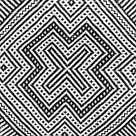 Un ejemplo de estas pictografías míticas sería la imagen abstracta de Woroto sakedi, es decir, el “dueño” de la waja “pintada” (waja tömennato), que a su vez representa la pintura facial de Odosha, que es el antagonista del Creador Wanadi y el generador del caos y la muerte en el mundo (ver la figura 6). Otro símbolo que vemos en la figura 7(ver figura 7) representa los “hombros de Wanadi” (Wanadi motai): la figura está conformada por una doble V dispuesta especularmente; la forma de V es una metonimia7 del carpintero real, pájaro asociado a la figura de Wanadi y cuyo lomo se carateriza por tener un patrón en forma de V de color blanco (Guss 1994, 149). El motivo por el cual hay una doble representación de la V se debe a que Wanadi sólo se manifiesta en el mundo de los mortales en la figura de su “doble” o avatar, en ye’kuana llamado damodede. La capacidad de desdoblarse es también facultad de los chamanes, quienes pueden abandonar sus cuerpos físicos para morar en el mundo “invisible”, lo cual nos lleva a la idea de “traslación”, ya que en el mundo ye’kuana pareciera haber siempre un juego entre lo visible y lo invisible, o bien, entre la manifestación oral y conceptual del mito y su traslación visible y tangible (Descola 2009). La noción de “traslación” también nos conduce a un sentido de perpetuo movimiento, un proceso de ida y venida en el que el conocimiento oral se plasma visualmente en el tejido, y el tejido ayuda a reactivar en la memoria de quien lo usa el recuerdo de su Origen.