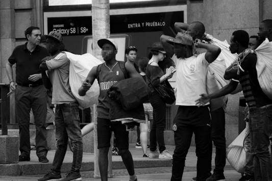 Many irregular migrants who work as manteros complained during our conversations about the undercover police who used their “invisibility” to pursue manteros. In Madrid, street vendors, normally locate in very touristy and busy areas such as the Gran Vía. The manteros are constantly ready to quickly gather together their blankets containing their merchandise and run if the police arrive. Undercover police usually work without obvious signs on their clothes to catch the street vendors unawares. Although the presence of undercover officers may be unnoticed to other city dwellers and tourists, many manteros told me they know how to recognize some undercover officers who normally work in the same areas(see figure3).