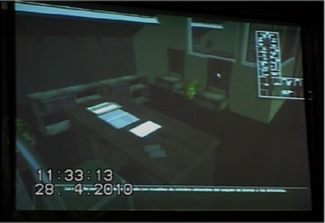La misma situación se repitió el 28 de abril de 2010, cuando brindó testimonio por la desaparición de su mamá ante el Tribunal Oral N° 5. Como se observa en las figuras 3a y 3b, Ana María describió con la misma voz firme y serena los usos de los distintos espacios del CCD que funcionó en el casino de oficiales de la Esma, que ahora llegaba hasta la sala de audiencia a través de un DID. A su lado estaba Martín Malamud, coordinador de Huella Digital que conducía la navegación por el interior del espacio reconstruido del CCD mientras Ana María, utilizando un micrófono, lo describía con minuciosidad. La sala permanecía en penumbras. El recorrido incluyó fotos que testimoniaban la presencia de detenidos en el lugar: inscripciones hechas con bolígrafo en una viga del campo por un detenido-desaparecido, etiquetas de cigarrillos, restos de bijouterie y tapitas de gaseosas. Al finalizar, las luces de la sala se encendieron y todos volvieron a su lugar. Un abogado defensor preguntó reiteradas veces: ¿qué estatuto tienen estas imágenes? La Fiscalía respondió: constituyen prueba aportada por la Fiscalía y están incorporadas a la causa.