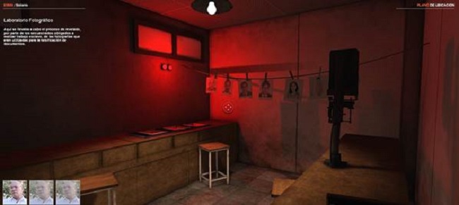 La inclusión de detalles de la época, como una heladera vieja o una chaqueta militar, sirve de vínculo entre la realidad y la ficción virtual, un vínculo especialmente delicado, por cuanto estos dispositivos redefinen la relación entre la imagen y su representación. Tal como lo afirma Barthes, las imágenes fotográficas, en su carácter de índices, traen al presente las huellas de lo sucedido. El referente captado por la cámara tiene que haber existido para que la imagen se produzca: “nunca puedo negar en la fotografía que la cosa haya estado allí” (Barthes 1990, 135-136). Hay una doble posición conjunta -de realidad y de pasado- mediada por el dispositivo técnico. En los documentales interactivos digitales, esta relación entre la imagen y la cosa se presenta como problemática, ya que el dispositivo técnico permite eludir la captación mecánica de la realidad recreando el espacio del CCD y eliminando la necesidad de una mediación entre imagen y objeto. Este hecho se expresa magistralmente en una suerte de juego de espejos en la reconstrucción virtual del laboratorio de fotografía que existió en el CCD Esma donde era obligado a trabajar Basterra, y desde donde pudo producir y preservar las únicas fotos existentes de un CCD, evidencias materiales de la realidad del campo. La figura 4 muestra cómo elcampo reconstruido del dispositivo recrea el laboratorio fotográfico donde se tomaron las únicas fotos del centro clandestino.