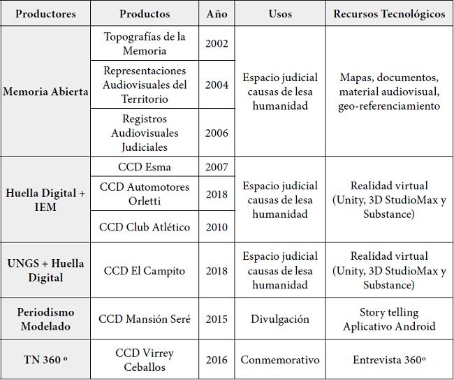 Varios de los más de seiscientos CCD utilizados y que hoy ya no existen o fueron transformados ediliciamente y destinados a otros usos han sido reconstruidos virtualmente desde cuatro plataformas: 1) Memoria Abierta4 -una alianza de asociaciones de derechos humanos que desarrolla una amplia gama de iniciativas en el campo de la defensa de los derechos humanos y la memoria- elaboró tres herramientas: Topografías de la Memoria5, que sistematiza la información sobre la totalidad de los CCD del país, Representaciones Audiovisuales del Territorio, que reconstruyen algunos de los CCD destruidos por la dictadura6, y los Registros Audiovisuales Judiciales; 2) los DID de Huella Digital7/IEM, que son el resultado de la colaboración entre una iniciativa académica con sede en la Universidad de Buenos Aires (UBA) y el Instituto Espacio para la Memoria (IEM), una agencia estatal orientada a políticas de memoria8; las otras dos iniciativas se originaron en el campo periodístico, 3) Periodismo Modelado (PM), surgido de una actividad pedagógica dentro de la escuela de periodismo Taller Escuela Agencia (TEA), que creó una plataforma de realidad aumentada de un CCD destruido9 y 4) Todo Noticias (TN), agencia que integra el grupo Clarín, el mayor multimedia de Argentina, que creó un reportaje 360º como forma de recordar la dictadura en el cuarenta aniversario del golpe de Estado10. El desafío que asumieron todas estas reconstrucciones fue hacer visible un pasado que ya no existe y del cual sobreviven pocas evidencias materiales. Una síntesis de todos estos desarrollos se encuentra en la figura 1.