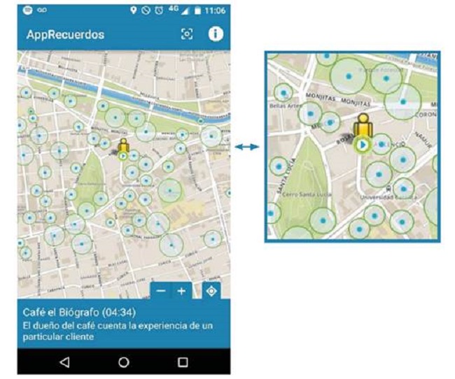 Dentro de este marco, la obra AppRecuerdos plantea la posibilidad de infiltrar la idea de lugares de memoria activa (Buchenhorst 2007), basada en la premisa de que los lugares son activados en la medida que acogen una experiencia cultural que vitaliza la interacción de significados entre los actores, el lugar y la ciudad. En cierto sentido, cuando se activa el audio-relato en el lugar se hace real la comprensión del lugar de memoria como dispositivo que significa tres cruces: el lugar como acumulación de tiempo (y la distancia que permite visualizar cuánto tiempo ha pasado desde sus primeros usos significativos), el lugar como una concentración de sucesos e historias (hechos concretos) y un espacio determinado (en cuanto cantidad limitada de metros cuadrados), tres dimensiones que se sintetizan y ponen en tensión cuando el relator llena de contenido vivo la huella urbana y el oyente revive el relato en el mismo lugar a través de la escucha.