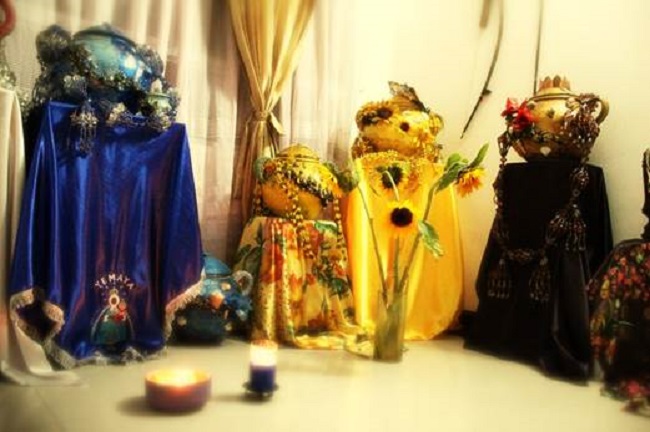De manera general para poder avanzar en el argumento que quiero presentar, he de “ensayar” a decir, únicamente, que estos sistemas religiosos a los que aludo tienen diferentes conformaciones históricas, productos inacabados del encuentro de distintos complejos culturales africanos, europeos y americanos1. Y es que los sistemas religiosos de inspiración afro se caracterizan por activar y reconfigurar disímiles estéticas que atraviesan la escultura, la pintura, la fotografía, la música, la danza, el cine y la literatura. Las imágenes plagan los espacios religiosos-cotidianos de practicantes y no practicantes y devienen multiplicidad. Estas posibilidades estéticas se producen en la concatenación de elementos que intervienen dentro de los espacios rituales como se muestra, por ejemplo, en las figuras 1 y 2.