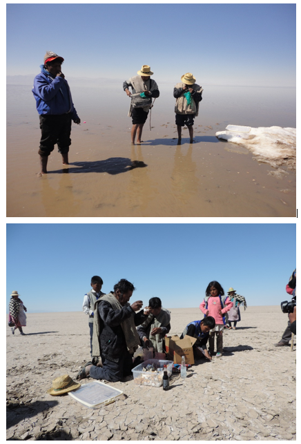 Sin embargo, muchos de estos ritos ya no se practican y el rito a la qucha mama, promovido por las organizaciones, es el que en este momento enacciona el principio relacionador subyacente en todos esos otros ritos que quedaron latentes. Como se puede apreciar en la foto, el rito no es un acontecimiento masivo, pero es una instancia intensa y emotiva: se va a recoger cuidadosamente un poco de agua en los pocos lugares remotos donde todavía queda agua, se trae esa agua en algún tipo de contenedor y se les hace una ch’alla de agradecimiento en medio de esa planicie arenosa. Es la “comunicación con el lago”, que se mencionó supra: se atiende al lago, se lo espera, se anhela que vuelva.