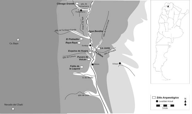 La Quebrada de Humahuaca se extiende por más de 130 km en el centro de la provincia de Jujuy. Su sector centro-sur (ver la figura 1) está delimitado hacia el norte por la quebrada de Purmamarca y hacia el sur por el Arroyo del Medio. Esta zona se caracteriza por la cercanía de las unidades medioambientales y geomorfológicas de puna, quebrada y yungas, permitiendo acceder a gran variedad de recursos a corta distancia. La quebrada de Tumbaya Grande, al oeste, y la de Huajra, al este, son pasos directos que conectan el sector con la puna y las yungas, respectivamente. Esta situación facilitó importantes interacciones entre grupos quebradeños y aquellos de otras regiones, generando una dinámica social que permite diferenciarlos de otros más septentrionales.