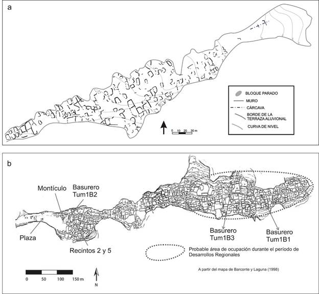 La plaza corresponde al espacio central del asentamiento; permite la concentración de un gran número de personas, articula numerosas rutas de circulación de distintos sectores y posee un alto índice de permeabilidad con recintos de grandes dimensiones, considerados también como vinculados con actividades públicas. La posibilidad de articular vías de circulación dentro del asentamiento y la relación con recintos próximos a la plaza, y también vinculados con actividades públicas, son características propias de espacios públicos de otros asentamientos de los Andes Centro-Sur. Tal es el caso de Los Amarillos (Nielsen 2006), Juella (Nielsen et al. 2004), Pueblo Viejo de Tucute (Albeck y Zaburlín 2007) y Bajo Laqaya (Nielsen 2006), entre otros.