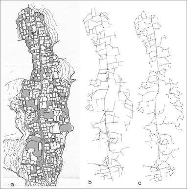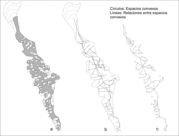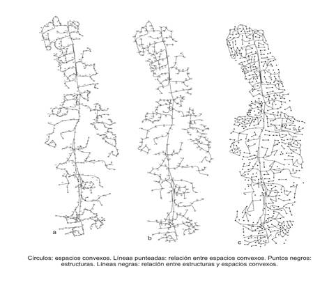 El estudio de la sintaxis espacial (Hillier y Hanson 1984), que configura los espacios externos a las viviendas (análisis alfa), inicia con su división en espacios convexos. La condición de convexidad es que ninguna tangente dibujada en el perímetro del espacio salga de este. A continuación, se elabora el mapa convexo, es decir, la expresión mínima de los espacios convexos que cubren el sistema. Posteriormente se confecciona el mapa axial, que representa la expresión mínima de las líneas rectas que pasan por cada espacio convexo determinando vínculos axiales entre ellos. Ambos mapas permiten calcular una serie de índices de utilidad para interpretar el espacio; a partir del mapa convexo se calcula el índice de articulación convexa, que muestra el grado de división del espacio, y se obtiene dividiendo el número de espacios convexos por el número de estructuras. Valores bajos en este índice demuestran una baja ruptura del espacio. El mapa axial permite elaborar el índice de articulación axial, es decir, el grado de articulación del espacio, y se obtiene dividiendo el número de líneas axiales por el número de estructuras. En este caso, valores bajos señalan un alto grado de articulación del espacio.