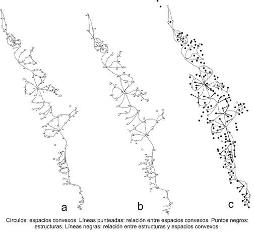 Como primer paso en la aplicación de la metodología de Hillier y Hanson (1984), y con el propósito de realizar el análisis alfa del espacio exterior a las viviendas de El Pobladito, se configuraron los mapas convexo y axial (ver la figura 3, a y b). Ambos permitieron obtener un total de 84 espacios convexos y 71 líneas axiales asociados a las 130 estructuras relevadas.