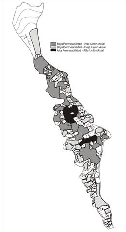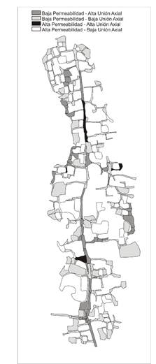 Los espacios de Alta Permeabilidad-Alta Unión Axial (en negro en la figura 8) son lugares donde se podrían llevar a cabo las dos funciones propuestas. En nuestro caso, representan al 1.91% de los espacios convexos, incluidos parte del camino y espacios repartidos por el sector.