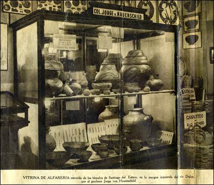 Esta correspondencia muestra que los bienes arqueológicos en ese momento poseían un valor monetario y circulaban tanto entre personas como entre instituciones. Jorge von Hauenschild participó en varias ferias en Argentina con su colección. Durante la Feria Industrial en Palermo, Buenos Aires, en 1934, parte de esta fue exhibida junto con dibujos de objetos arqueológicos de los Wagner y artefactos artesanales de Santiago del Estero. En estas ferias las provincias exhibían sus productos naturales y culturales detrás de vitrinas, en sus respectivos pabellones, los cuales reflejaban la manera en que cada provincia se autorreferenciaba; von Hauenschild envió un total de 272 artefactos a la feria, en su mayoría pucos y urnas funerarias, al pabellón de Santiago del Estero. Allí se presentaron cuatro paneles donde se expusieron la industria forestal, la agrícola, las minas de Ojo de Agua y las Termas de Río Hondo. Se exhibieron telares, colecciones de alfombras y cestería junto con productos agrícolas y minerales. Durante el discurso inaugural de la feria, el Dr. Lorenzo Fazio Rojas, del pabellón de Santiago del Estero, habló del progreso de la provincia y acerca de las culturas que vivieron allí mucho antes el descubrimiento del Nuevo Mundo, y cómo estas llegaron a un alto grado de progreso material y de cultura espiritual. La idea central del discurso fueron el progreso y la modernidad, así como la importancia de los productos naturales nobles y su industria forestal que habían entregado sus recursos vírgenes en aras del progreso nacional; relató cómo la tierra fue liberada para que el hombre pudiera seguir trabajando y cosechando sus inagotables frutos. Ese discurso muestra la importancia que se otorgaba a demostrar el progreso de la provincia y su alineamiento en el proceso progresista, a la par de las otras provincias argentinas (La Nación, 3 de febrero de 1934; El Mundo, 4 de febrero de 1934; La Prensa, 12 de abril de 1934, figura 1)2.