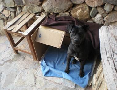 Corría el año 2012 y me había mudado hacía semanas a La Falda, un barrio en el pueblo de Tilcara1, cuyas casas están “colgando” sobre la ladera del cerro. A los pocos días de instalarme allí, comencé a recibir visitas caninas inesperadas, aunque debo decir que algunas se parecían más a inspecciones técnicas oculares: venían, miraban y se iban. En algunos casos logré generar confianza rápidamente y en otros, específicamente en el de Pilo, me costó horrores lograr siquiera poder tocarlo, ya que era muy huidizo. Con paciencia y curiosidad, sin darnos cuenta, comenzó a pasar tiempo conmigo; venía a recibirme cuando llegaba, subía la escalinata hasta mi casa corriendo y se quedaba. Cuando empezó a llegar el invierno, le puse una caja de cartón con frazadas, y de a poco, se fue instalando (figura 1).
