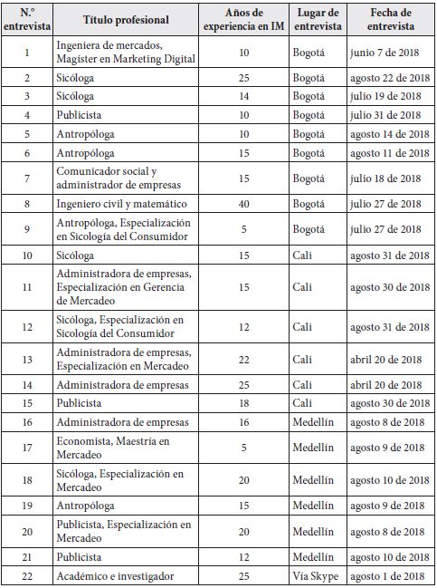 Conviene mencionar que las entrevistas se hicieron a profesionales del campo de la IM en Bogotá, Cali y Medellín. En estas tres ciudades, la IM se ha institucionalizado y profesionalizado al punto que allí hacen presencia grandes multinacionales del sector. En total, fueron entrevistados seis hombres y dieciséis mujeres, todos en un rango de edades entre los 32 y los 60 años y con un mínimo de cinco años de experiencia profesional. Nótese que la mayoría de personas entrevistadas estuvo constituida por mujeres (72 %). En principio, creímos que era algo azaroso; sin embargo, cuando discutimos este tema con los mismos entrevistados, encontramos que, en su experiencia, los profesionales de este campo sí son en su mayoría mujeres, un asunto nada menor que, sin embargo, va más allá de los alcances de este texto. Ahora bien, puesto que un porcentaje importante de las personas entrevistadas señaló que por motivos legales y políticas de confidencialidad de sus empresas preferirían ser tratados como informantes anónimos, para estandarizar y dar cierta coherencia formal, en este artículo decidimos obviar el nombre de todos los entrevistados, pero señalar su rol dentro del campo y, de esa manera, poner en contexto su testimonio. En el siguiente cuadro (figura 1) se numeran las entrevistas -tal y como son citadas a lo largo del texto- y se señala la profesión y el tiempo de experiencia de cada entrevistado: