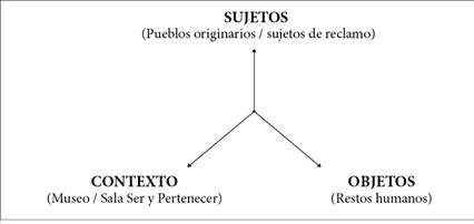 Una vez aplicadas las reglas de análisis, se contó con un segundo corpus formado por el conjunto de definiciones contextuales: “La definición contextual es aquella mediante la cual se establece el sentido que adquiere un término cualquiera presente en determinado segmento textual completo, en función del contexto al que dicho término aparece asociado en ese mismo segmento” (Magariños de Morentin 2008, 178). A partir de un determinado repertorio de definiciones contextuales, se identificaron los ejes conceptuales según los cuales pueden agruparse las definiciones obtenidas. Entre las categorías organizativas, jerarquizamos en esta instancia tres campos de definiciones: 1) el de los pueblos originarios y el reconocimiento del sujeto colectivo del reclamo; 2) los restos humanos en sus variadas modalidades de enunciación; 3) las definiciones asociadas al museo como espacio de autoridad, de la que a su vez se desprende la exhibición. En síntesis, se reconocen tres ejes conceptuales en relación con la organización de las definiciones contextuales: objetos (en este caso, RH), sujetos (en este caso, pueblos originarios que reclaman) y contexto (el museo, particularmente la exhibición de la sala SyP) (figura 1).
