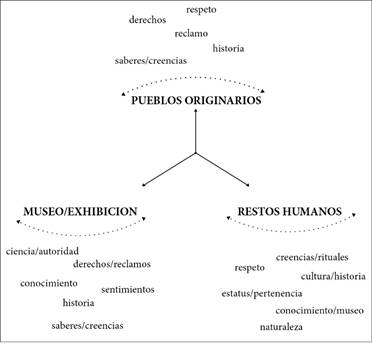 En relación con el museo/exhibición: el museo aparece como el lugar donde se accede al conocimiento científico a la vez que un espacio para ejercer el respeto hacia las comunidades. De cualquiera de las dos maneras, es un lugar de autoridad. En relación con los RH, estos ocupan variadas posiciones: por un lado, como objetos (cosa) motivo de estudio y, por otro, como personas, ancestros, motivo de prácticas rituales. Finalmente, en relación con los pueblos originarios, se reconocen dos posturas: la disolución completa de su presencia -quedaron en el pasado, son historia-; en el otro extremo, la pertenencia es la expresión de su existencia y, por lo tanto, surge la posibilidad del reclamo. Este sujeto colectivo se hace presente en el discurso de forma explícita o implícita (figura 4).