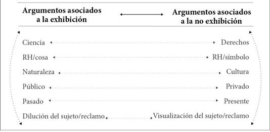 En esta instancia, los argumentos fueron organizados según una serie de oposiciones tales como público/privado; ciencia/derechos; no identificado / identidad; RH cosificado / RH símbolo; dilución / visualización del sujeto colectivo del reclamo; pasado-historia/presente; naturaleza/cultura; museo/comunidad. La figura 3 muestra en dos columnas los componentes de los argumentos en contra y a favor de la exhibición.