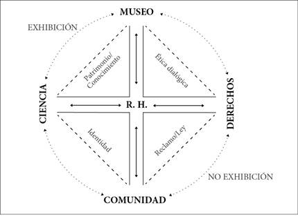 Esta red conceptual, producto del análisis de discurso de “lo dicho” por los visitantes en las entrevistas, articula la movilidad argumental en torno a tres elementos que se combinan para dar fuerza a la diversidad en su aparición discursiva. En el centro, ubicamos el referente de análisis, los restos humanos (RH), y reconocemos dos pares de oposiciones que delimitan el campo de distribución de las representaciones: museo y comunidad (reclamante) por un lado y ciencia y derechos por otro. Paralelamente, la ciencia pone al RH en el lugar de objeto de estudio y del cual legitima su identidad, mientras que, legitimando el derecho sobre el patrimonio, el RH es motivo de un reclamo, sustentado en la identidad y la pertenencia. Los argumentos más fuertes sobre la no exhibición se posicionan en la triangulación RH/derechos/comunidad, en tanto que, por el contrario, los argumentos más fuertes que aprueban la exhibición se ubican en la triangulación RH/ciencia/museo.