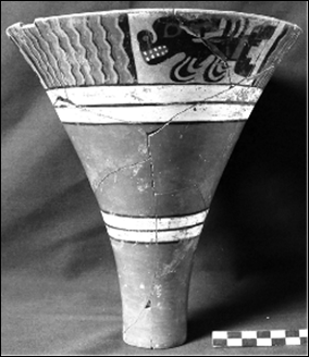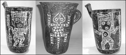 Al respecto, existe un tipo particular de cerámica Tiwanaku, los ch’alladores, que son vasos embudo orientados a convidar bebida al subsuelo. Estos tienen fondos negros o rosas, a diferencia de la cerámica más común de Tiwanaku. Las figuras se han interpretado como motivos estelares, motivos “del pasado” como sapos o manos, reinterpretados desde esculturas o arte rupestre del período Formativo o Arcaico y sobre todo seres que mezclan desordenadamente características anatómicas de varios animales, o que presentan una anatomía deliberadamente amorfa, casi un esfuerzo por dibujar lo desconocido, lo potencial (Villanueva 2015b). Ver figura 4.
