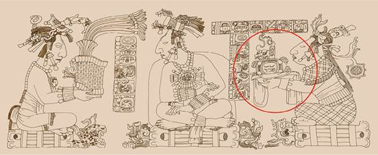 Esta escena y este envoltorio específico hacen referencia al papel de esos objetos durante ceremonias de entronización, que actuaban como elementos conectados a los orígenes comunitarios de Palenque con los fundadores míticos de esas comunidades, evocados bajo esa forma de contacto con importantes ancestros (Reents-Budet 2006, 115). Guilhem Olivier destaca que los envoltorios que contenían huesos o reliquias de ancestros o divinidades tutelares, funcionaban como una especie de memoria identitaria, constituyente de una identidad colectiva de un grupo específico (Olivier 2007, 301).