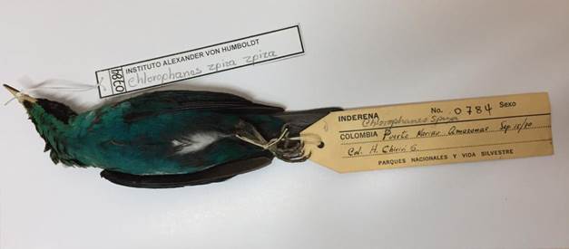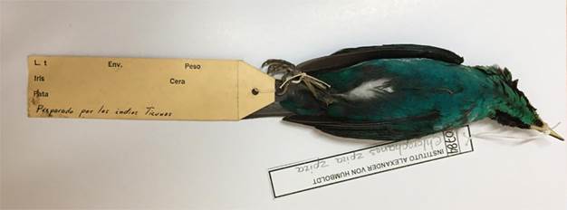De acuerdo con Consuelo, quien también hace parte del equipo de aves, en aquellos días muchos investigadores se valían de sus ayudantes de campo y guías locales para capturar y procesar ejemplares. Para ella, tal vez la aclaración en la etiqueta advierte además a los investigadores del futuro, como nosotros, que estos especímenes no necesariamente fueron procesados por manos expertas. Aun así, vista desde el siglo XXI, esta información en algunas etiquetas es relevante, no solo por ser inusual, sino porque las comunidades indígenas del país en el presente son reacias a la colecta de ejemplares en sus territorios.