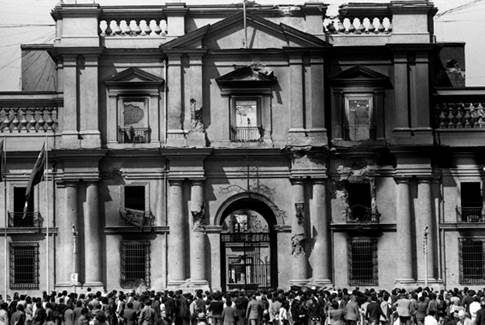 Después del bombardeo del 11 de septiembre, el centro de Santiago permaneció cerrado. No se podía entrar ni salir, no recuerdo cuántos días. El primer día que se autorizó libre circulación, partí con mi hijo de cinco años y como padre “ejemplar” le mostré La Moneda. Solo podían tomar fotos aquellos autorizados y acreditados por los militares. Llevar una cámara era motivo para ser delatado por cualquiera. Llevé una cámara debajo de la chaqueta y otro objetivo en el bolsillo. Tomé pocas fotos y muy rápido me fui del lugar.