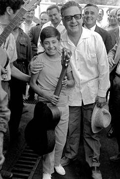 De hecho, la imagen frente a la cual estás ahora expuesto, hoy plasmada en este trabajo como fruto de una decisión del etnógrafo afectado, es copia de un negativo del cuerpo fotográfico de Poirot, que Luis ha protegido y cuidado durante casi cinco décadas de su vida. Fue tomada en la maestranza de lo que era la Empresa de Transportes Colectivos del Estado, donde se reparaban los buses. El niño con guitarra es hijo de un trabajador de esa empresa estatal durante una visita que realizó Salvador Allende -en la foto sonriendo y con sus zapatos empolvados- en la campaña electoral de enero de 1970. Es uno de los negativos que Luis más tardó en ampliar a través de ese proceso largo y doloroso que implicaba enfrentarse a ellos: