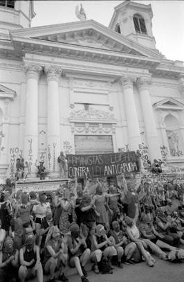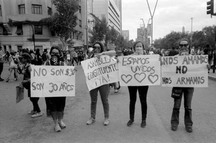 Hace menos de un año, en octubre de 2019, Luis Poirot volvió a fotografiar las manifestaciones sociales del así llamado “estallido social” chileno, cuando las calles del país fueron pobladas por ciudadanos y ciudadanas que protestaban en contra de un Estado regido por la constitución ideada en la dictadura, caracterizada por una extrema debilidad estatal, un libre mercado radical y una defensa exhaustiva -y militarizada- de la propiedad privada como valor supremo, configuración de poderes que posibilitó el desarrollo de una de las desigualdades más abismantes de la región. Entre los varios actores y múltiples fuerzas de protesta que surgieron en las calles, millones de mujeres expresaron el deseo ferviente de protestar “Hasta que la dignidad se haga costumbre”, para decirlo con el moto principal del movimiento.