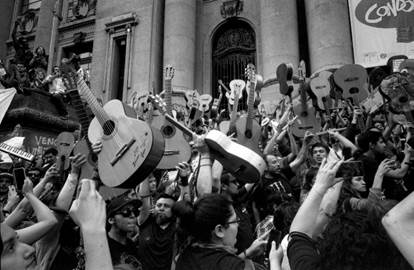 cuando se juntaron muchas guitarras en la puerta de la Biblioteca Nacional y tocaron las canciones de Víctor Jara. Yo estaba sacando fotos. No pude evitar que me salieran las lágrimas, tuve que dejar de fotografiar por un momento. Víctor estaba vivo, estaba ahí en ese lugar. Me dio alegría, mi llanto era de emoción, felicidad. Ahí estaba en las guitarras, en las voces de la gente que no lo conoció y no lo olvida.