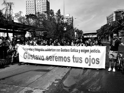 El muchacho que quedó ciego, Gustavo Gatica, estudiante de psicología de 21 años, fue herido en sus dos ojos por balines de la policía chilena el 8 de noviembre de 2019, en algún momento entre las 18:07 y las 18:27 horas. Gustavo Gatica es uno de los casos más graves entre los más de doscientos de lesiones oculares ocurridos en el estallido9. La represión del estallido intentó fuertemente silenciar a los fotógrafos y no a la televisión, porque esta última entregaba la verdad oficial de las autoridades; en cambio, el fotógrafo, sus ojos, su cámara, su registro, sus materiales, eran algo que el Estado no podía controlar: o, para decirlo con palabras de Marisol de la Cadena, “el Estado se mueve con representación; el Estado es representación, o como es representación, no quiere dejar evidencia de lo que es, entonces cancela la evidencia de lo que es” (comunicación personal, julio de 2020). Es probable que la policía viese a la cámara con teleobjetivo como un arma y a su portador el enemigo a abatir, casi en un reflejo automático, práctica represiva que las mismas imágenes plasmadas en las murallas de las calles denuncian con la fuerza de una fantasmografía urbana: