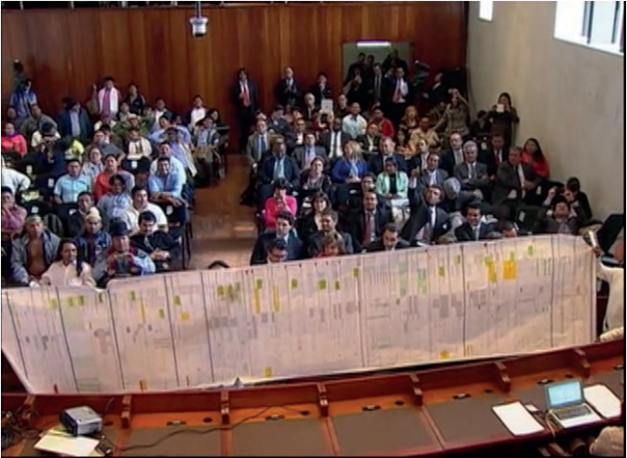 Esta concisión es una cualidad estética que potencia la persuasión a través de los números, un asunto no despreciable, pues la Corte amonestó al Gobierno, en anteriores oportunidades, por evadir a sus preguntas mediante documentos ridículamente extensos, por lo que pidió un informe conciso para la audiencia16. Pero la concisión está también en las cifras, lo cual nos lleva a lo que no se ve. Las cifras de las tablas presentaban la totalidad de dinero por entidad y, en el caso del Sistema General de Regalías, por proyecto. Así, no son “datos a secas”, previos a una interpretación, sino que envuelven un doble resultado: por un lado, de la agregación de infinidad de cifras más pequeñas y, por otro lado, de la labor misma que implica hacer esta agregación y otras operaciones, como las múltiples decisiones sobre qué se puede y qué se debe contar. Es decir que las cifras de las tablas no son únicamente una sumatoria, sino que también son el resultado de hacer la sumatoria en sí, de decidir qué debería sumarse. De ahí que no sean datos en bruto sino datos construidos, y en esa construcción hay decisiones e interpretaciones.