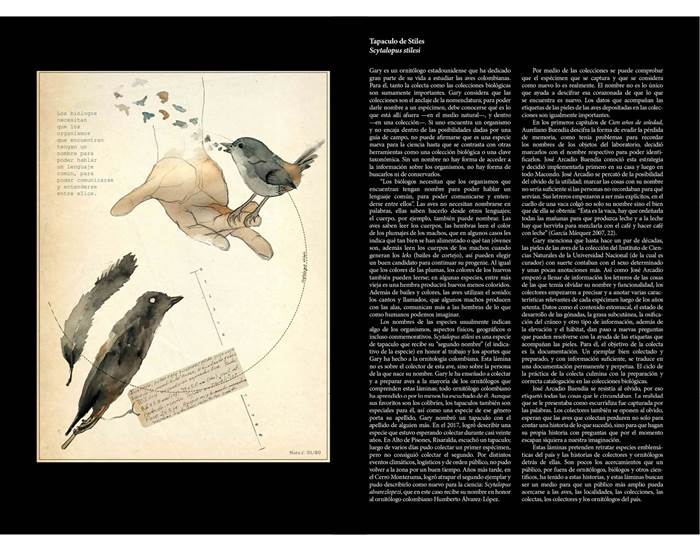 La lámina titulada “Tapaculo de Stiles”, condensa aspectos de la reflexividad de Gary frente a su propia experiencia como colector; estructura una narrativa textual que evidencia parte de su trayectoria y explica el origen del nombre atribuido a esta especie particular (Scytalopus stilesi, Cuervo et al. 2005 ) como homenaje a sus aportes al campo ornitológico. La narrativa textual se articula con una composición gráfica que contrapone el tapaculo cantando sobre una mano y una piel cuyo diseño se basó en el ejemplar que se utilizó para describir a la especie (ICN-34569). La ilustración de la etiqueta que acompaña la piel reproduce la caligrafía original que reposa en el ICN1. A este ensamblaje entre narrativa textual y composición gráfica es al que llamamos lámina y asociamos con un dispositivo, porque tiene la intencionalidad de comunicar información diversa sobre los colectores, sus prácticas, su reflexividad y las especies de aves que se asocian a historias particulares. El trabajo de grado que dio origen a este dispositivo gráfico-narrativo (Niño-Rodríguez, en preparación) contiene más de veinte láminas que describen experiencias asociadas a diez colectoras y colectores. En este ensayo solamente se incorporan dos de ellas, a manera de ejemplo, ya que la reflexión principal que buscamos compartir tiene que ver con el proceso de elaboración que dio lugar a las láminas más que con el resultado. Ahora bien, la expectativa al final del trabajo de investigación, que posibilitó las láminas, es encontrar nuevas maneras de vincularlas con información complementaria sobre la colecta, los colectores y las colecciones que pueda fluir por canales de difusión más amplios y heterogéneos, que trasciendan el de los círculos especializados asociados a la biología y a las instituciones de investigación científica.