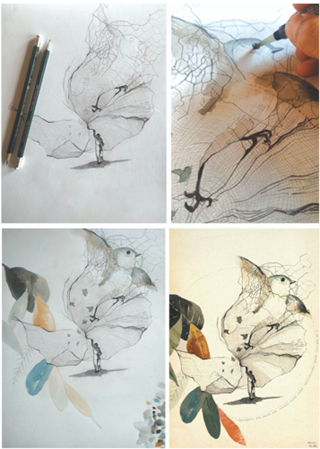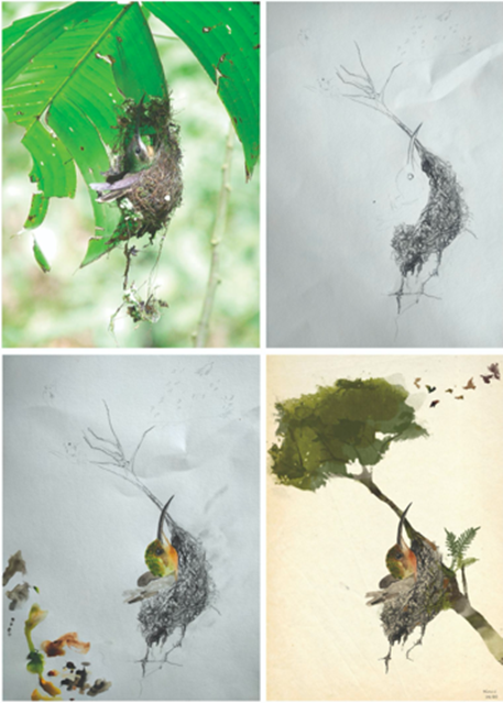 Los tres momentos del proceso de colecta y clasificación: el ave viva, la piel extendida y la piel catalogada con su etiqueta, como parte de una colección, se representan en esta ilustración con cierto nivel de verosimilitud con las imágenes de referencia. Martínez y Hernández-Manrique (2020) mencionan que el ave que volaba en el bosque, el ave capturada que se atrapa con la red de niebla y el espécimen que ingresa a la colección articulan un referente (ave o espécimen, por ejemplo) a conjuntos de relaciones diferentes que hacen que el ave y el espécimen sean cosas distintas. Así́ como la práctica de colecta se puede dividir en tres momentos: antes, durante y después, la creación de las ilustraciones también es procesual e implica varios niveles: reflexivo, analítico y narrativo-comunicativo, que se en-red-an para producir un sentido muy particular sobre las especies y los colectores.
