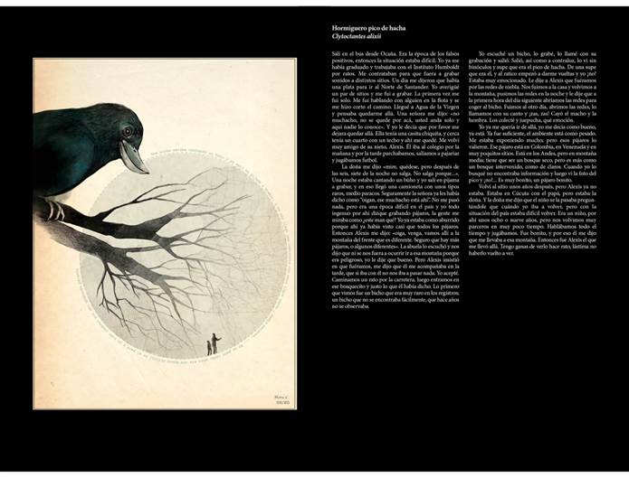 La narrativa textual de las láminas refleja experiencias muy diversas de los colectores: si la lámina de F. Gary Stiles se estructura a partir de eventos que giran en torno a su vida y reconocimiento en el campo ornitológico, la narrativa de la lámina de Óscar Laverde-R., sobre el “Hormiguero pico de hacha”, responde a una crónica basada en una experiencia muy personal que experimentó en su labor como colector y que se abrió a compartir (Ilustración 9). Esta experiencia refiere a otras dimensiones que rodean la práctica, que se asocian a las relaciones interpersonales que emergen en campo y a los vínculos afectivos que los colectores construyen con diversos actantes (humanos y no-humanos) que confluyen en las redes de colecta.