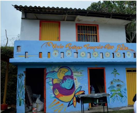Respecto al trabajo para el goce, es de resaltar que, además de las diferentes actividades que pueden identificarse como fiestas -verbigracia, el Festival de Talentos, las Fiestas del Retorno, entre otras-, es frecuente encontrar en la vereda un “aire festivo” que acompaña las diferentes labores cotidianas, así como las actividades recreativas y deportivas que se ven constantemente en la escuela y en la placa polideportiva. De ahí que no resulten extrañas las palabras que quisieron inscribir en uno de los murales que se hicieron para la restauración de la escuela, como símbolo de su comunidad: Vivir, Soñar, Sonreír, Ser feliz (figura 1).