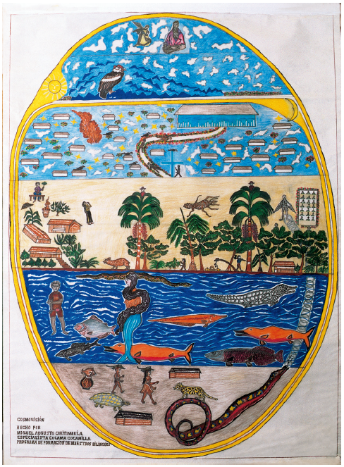 Desde la antropología, como señalan Orlove y Caton (2010), el agua no se considera solo un recurso sino una sustancia que conecta diferentes esferas de la vida social. En esta línea, en su investigación etnográfica sobre cosmología acuática kukama, Campanera sostiene que “los ríos son espacios complejos, claves para la circulación de personas y mercancías” (2018, 200). Y, entendiéndolos así, es relevante señalar que los kukama desde la época colonial han sido conocidos como grandes pescadores y navegantes en tanto tenían una sofisticada sociotécnica pesquera al navegar más allá de sus límites jurisdiccionales (Campanera 2018). Además, sus relatos de origen y su cosmología siempre han estado vinculados con el agua (Regan 2011). En esa línea, para ellos el agua es parte de su historia e identidad constitutiva ya que debajo de las superficies de los ríos existe otra sociedad. De tal modo que “en los cuerpos de agua viven una diversidad de seres, […] en los lagos también hay pueblos y ciudades idénticos a los terrestres” (Campanera 2018, 200). Este pensamiento es coherente con la postura ontológica de Descola. Supone que la condición humana es compartida con no-humanos y mantiene atributos como la sociabilidad y la subjetividad. Para entender mejor esta concepción veamos la clasificación tripartita de los mundos según los kukama: la tierra, el cielo y el mundo del agua (Berjón y Cadenas 2014). En este último habitan diferentes seres, como el yacuruna, la sirena, los bufeos y además las personas que viven dentro del agua. Al respecto, contamos con un dibujo del maestro kukama Augusto Caritimari que nos permite acceder a esta geografía particular (figura 1).