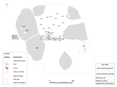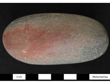 Se obtuvo una única datación absoluta para este estrato. Una muestra de carbón vegetal (de especie no identificada), recuperada del mismo, fue fechada por radiocarbono mediante la técnica de espectrometría de masas con acelerador (AMS), en los laboratorios del Centro Nacional de Aceleradores en Sevilla, España. Este análisis dio como resultado una cronología de cal 10087 a. C.: cal 9813 a. C. (calibración 2σ, 95 % probabilidad). Estos hallazgos, que interpretamos como implementos para la preparación de pigmentos (paletas y mortero) y que podemos relacionar con la actividad pictórica más temprana, estaban amortizados por una acumulación de caracoles terrestres de la especie Bostryx Peliostomus (aproximadamente 300 ejemplares), dos ejemplares de la especie Systrophia, característicos por tener la concha plana y una valva del molusco marino Choromilitilus Chorus. Las dos primeras especies son propias de los hábitats más húmedos de la vertiente occidental de los Andes entre los 700 y 2 100 m s. n. m. (Ramírez et al. 2012), y el abrigo presenta condiciones idóneas para su reproducción, mientras que el Choromytilus Chorus es una especie que procede del Pacífico. La documentación arqueológica confirma que estamos ante depósitos intencionados, que informan sobre la capacidad de interacción que en este momento existe con la costa. Esta actividad estaba amortizada por un sedimento de tierra oscura y bastante compacta, de la que se recuperó un conjunto de elementos de jaspe de colores marrón oscuro, caramelo y amarillo: desechos de talla (26 piezas, entre láminas y lascas), un núcleo fragmentado, cinco lascas con retoque unifacial y un buril como única pieza bifacial. También se recuperó un posible percutor fragmentado de cuarcita gris, con huellas de múltiples golpes en ambos extremos. Esta materialidad constata la relación de las personas que ocuparon el abrigo en ese momento con la sierra, al estar las vetas más cercanas de jaspe en la vertiente oriental de la cordillera Negra, en el sector de Jangas sito a unos 40 km en línea recta hacia el sureste de Motumachay; también que la actividad de talla se desarrolló en este espacio.