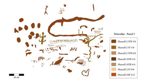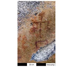 En cuanto al modo de aplicación del pigmento, diferenciamos la realizada con los dedos (digitada), con la mano (estampada en positivo) y la ejecutada con algún instrumento que no es imposible identificar. Y en cuanto a la elaboración del diseño, apreciamos las siguientes modalidades: el silueteado o contorneado (en el que el trazo delimita la forma), la tinta plana (en la que el diseño es completamente relleno con pigmento) y el punteado o trazo discontinuo que va delimitando la forma de lo representado. Podemos adelantar que las muestras del abrigo de Totocahja han sido estudiadas mediante espectroscopía Raman (equipo: espectrómetro Raman Confocal XploRa Horiba, Departamento de Química, Facultad de Ciencias, Universidad de los Andes), una técnica que permite caracterizar la composición de los pigmentos y que señala, en este caso, la presencia de arcilla, sílice, hematita o goetita, todos ellos componentes inorgánicos.