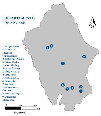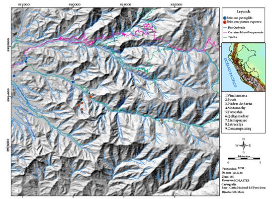De la totalidad de sitios registrados, seis se localizan en el espacio longitudinal al eje de la cuenca del río, dos en su vertiente meridional, Vinchamarca y Cancampacataq, y cuatro en la septentrional, Motumachay, Piedras de Breña, Pocós y Totocahja. Los otros tres, Qellqemachay, Llamapuquio y Letracahja se ubican en la quebrada Cayapunta (figura 3). Desde el punto de vista de la movilidad, los sitios con arte se emplazan a lo largo de caminos naturales de tránsito.