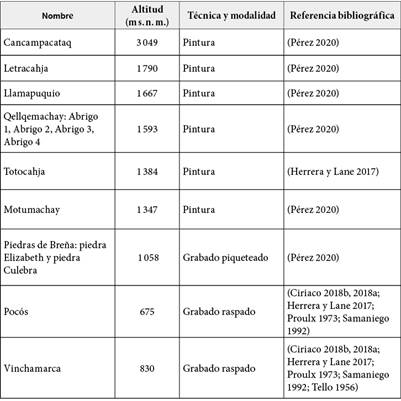 Previo a nuestro trabajo, realizado entre los años 2018 y 2019, se tenían referencias de sitios con arte rupestre. Un abrigo pintado en la parte más estrecha del valle, el abrigo de Totocahja (Herrera y Lane 2017), y dos agrupaciones de bloques grabados en la parte baja, Vinchamarca (Herrera y Lane 2017; Proulx 1973; Samaniego 1992) y Pocós (Ciriaco 2018).
