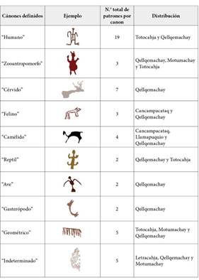 El canon “humano” existe únicamente en dos sitios, Qellqemachay y Totocahja, y los cánones zoomorfos se registran en cuatro, Qellqemachay, Cancampacataq, Totocahja y Llamapuquio. De las especies animales representadas solo los camélidos no existen en la actualidad en la cuenca. Aunque escasos, siguen existiendo en las partes altas de las quebradas meridionales y septentrionales dos tipos de cérvidos, la taruca o venado andino y el venado de cola blanca. En cuanto a los felinos, se conservan en el área poblaciones de puma que, además, han sido observados recientemente en la quebrada Cayapunta.