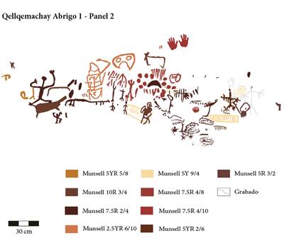 Conscientes de que es una cuestión discutible, porque no existe una relación física directa entre las pictografías y la única muestra datada del estrato más antiguo de Motumachay, hallamos en él elementos que podrían asociarse a la ejecución de las grafías más antiguas. Esto es, las paletas y la mano con restos de pigmentos, cuyo color se asemeja a las pictografías del Panel 1. Estas cronologías, siendo las más antiguas para los Andes centrales, sí están en consonancia con datos obtenidos para ocupaciones datadas en la transición de Pleistoceno-Holoceno y el Holoceno Temprano, vinculadas con grafías pintadas figurativas en abrigos de los Andes centro-sur como Toquepala en Perú (Muelle 1969), San Lorenzo 1 en Chile (Núñez et al. 1997) y Hornillos 2 en Argentina (Yacobaccio et al. 2012).