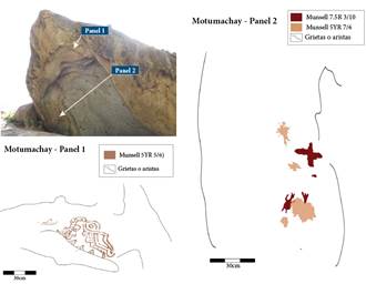 El Panel 1 está en el techo, donde la superficie es ligeramente granulosa, de color gris claro y con una fina concreción de color beige sobre la que se realiza la pictografía, a una altura del suelo actual de 5,50 m. Está delineada con trazos modulantes que conforman líneas curvas y cierran espacios vacíos de pigmento, algunos de los cuales se rellenan con puntos o triángulos. El Panel 2 tiene un conjunto de grafías situado en el lado occidental de la pared del fondo del abrigo, donde la superficie es ligeramente cóncava de color gris claro y lisa. Ocupa un espacio de 60 por 30 cm, las grafías más altas están a 90 cm de la superficie y se aplicó la tinta plana para su configuración. Con base en las superposiciones y el color, identificamos dos eventos pictóricos. El más antiguo corresponde a las realizadas en color rojo. Del segundo se identifican manchones de pigmento rojo amarillento que se superponen a dos motivos del primero y se esparcen por el resto del panel.