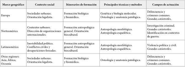 Estas condiciones e itinerarios de formación de los antropólogos, junto con las peculiaridades y particularidades sociales de cada país, contribuyen a definir y orientar, no solo los perfiles y recorridos profesionales de los antropólogos forenses, sino también sus ámbitos y campos de estudio e intervención (figura 1).