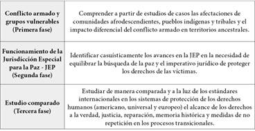 A partir de lo anterior, el estudio se centra en tres grandes categorías para la comprensión del fenómeno objeto de estudio y el análisis cualitativo de los hechos: 1) conflicto armado y grupos vulnerables, 2) funcionamiento de la Jurisdicción Especial para la Paz y 3) estudio comparado. El estudio, por demás, se llevará teniendo en cuenta como elemento transversal los pronunciamientos de la Corte Interamericana en el caso. Esto lo hará a través de un extenso rastreo doctrinario temporalmente establecido desde el 2003 al 2021. Lo aquí desarrollado, no obstante, se centrará en el análisis de la primera categoría:
