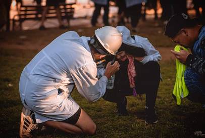 De este modo, el cuerpo de las/os brigadistas se convirtió, así como para las/os manifestantes, en la condición de posibilidad para la lucha y la resistencia, posibilitándoles a las/os brigadistas, en términos de Ortega (2008), persistir, absorber y sobrellevar la violencia estatal, brindando cuidados y protección a los manifestantes (figura 3), expresados en la atención en salud y el resguardo frente a la violencia dirigido por un objetivo político. Un fenómeno recurrente en los escenarios de revuelta social en Chile, según observan Márquez y Hoppe (2021) y Rivera-Aguilera, Imas y Jiménez-Díaz (2021), para quienes el cuerpo en estos contextos pasó a materializar la lucha del pueblo y sus reivindicaciones.