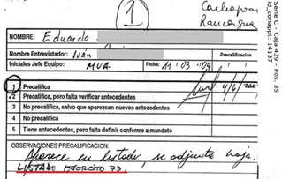 En la figura 5 se observan tachas realizadas por el INDH a nombres de terceras personas, sobre el artefacto “glosa”, utilizado para inscribir los principales antecedentes que le permitan a la CV formarse convicción sobre la calidad de víctima de la persona declarante. Como estas hay otras tachas que silencian elementos de los hechos represivos o, incluso, a la misma persona titular de la carpeta. Así, la tachadura produce una verdad muchas veces fragmentada que dificulta una lectura comprensiva de los hechos victimizantes, de las experiencias y relatos de las personas sobrevivientes, pero, también, de los criterios y procedimientos utilizados por la Comisión de Verdad.