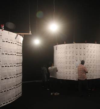 En este punto de mi recorrido reparo en que mi primera impresión al ingresar a la sala fue que RN era rígida e inhumana. Tuve esa impresión porque, al ver las estructuras sin conversar con las protagonistas, noté un montaje espacial mecánico y calculado, donde todos los elementos están perfectamente distribuidos, algo que va contra la imperfecta naturaleza humana, como en un juzgado, donde se diferencia el espacio del funcionario, un cubículo, y el del civil. Espacio de la obra definido por muros de papel blanco con tinta negra, que operan como una reja o una celda por sus huecos, unidos por un material severo como los ganchos metálicos de papel. Esta impresión de rigidez se mantuvo cuando las dos protagonistas dieron sus testimonios con la máscara, porque las percibo casi como funcionarias dando testimonios de manera mecánica, por lo que pienso en una hipérbole de la burocracia. Pero, cuando dialogo con ellas a través del muro establezco una comunicación fluida e íntima, donde se devela un cuerpo, una vida que expresa su lucha y su sentir. Esta conversación, sin embargo, no se da cara a cara, ya que cuando hablo con ellas a través de los muros de papel, ellas me ven, pero yo no; como si el espacio se volviera un confesionario, que invierte su sentido, porque quien se confiesa es quien ve al otro. Así, mi primera impresión de rigidez de la obra se transforma paulatinamente en una sensación de afección.